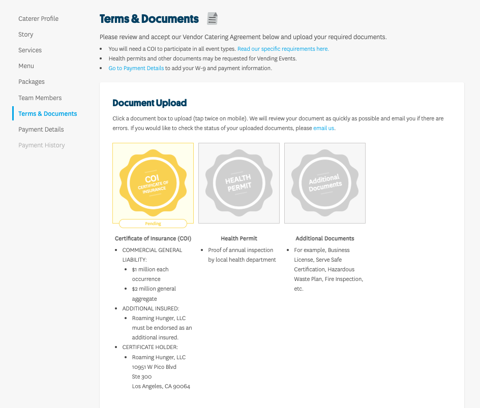 Click/tap each field to upload files to their categories. When the field turns yellow, you have successfully submitted your document. Each document will remain yellow until Roaming Hunger reviews it. (This may take 1-2 business days.)You will know your documents' status by their color. Green means "Approved," and Red can mean "Rejected" or "Expired." If your document has been rejected, check your email, as you would have been notified the moment it was rejected.